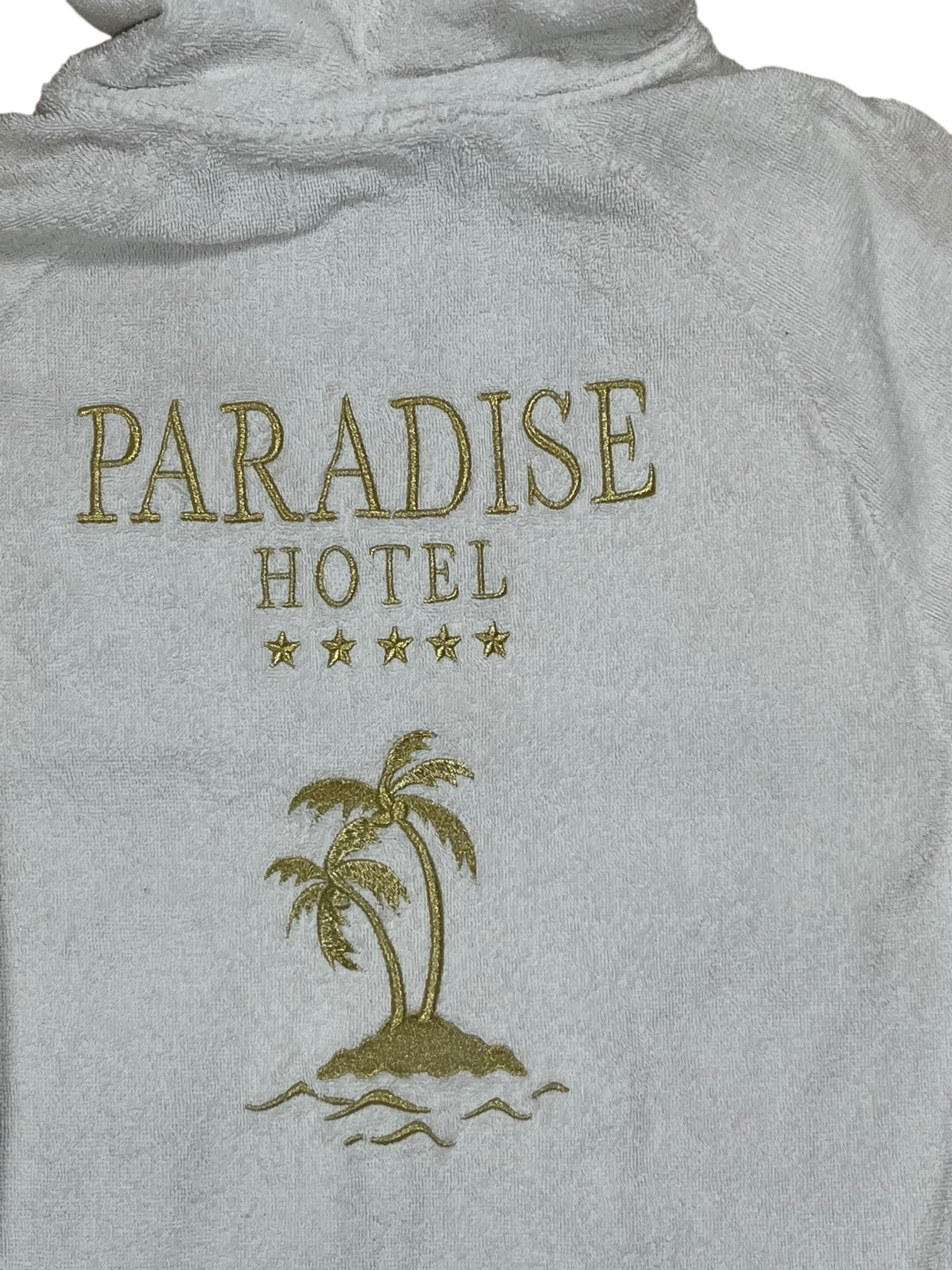 • Gold embroidered palm tree + 5-star “Paradise Hotel” motif (front + back)