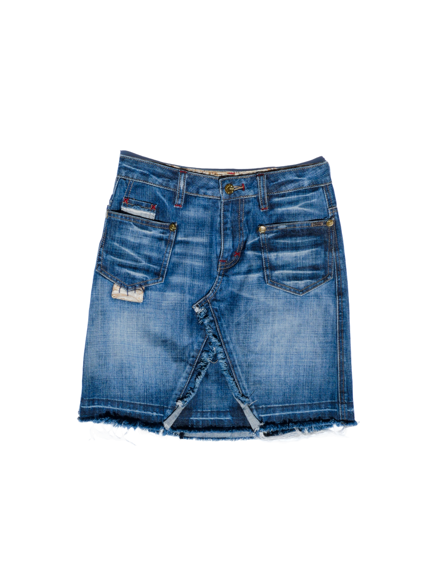 Total Y2K energy. This vintage Chevignon denim skirt serves low-rise drama with a raw asymmetric back split, floral embroidery, and distressed hem that looks like it just walked out of a TRL music video. Heavy fading, contrast stitching, and a perfectly thrashed finish give it that lived-in look you can’t fake.