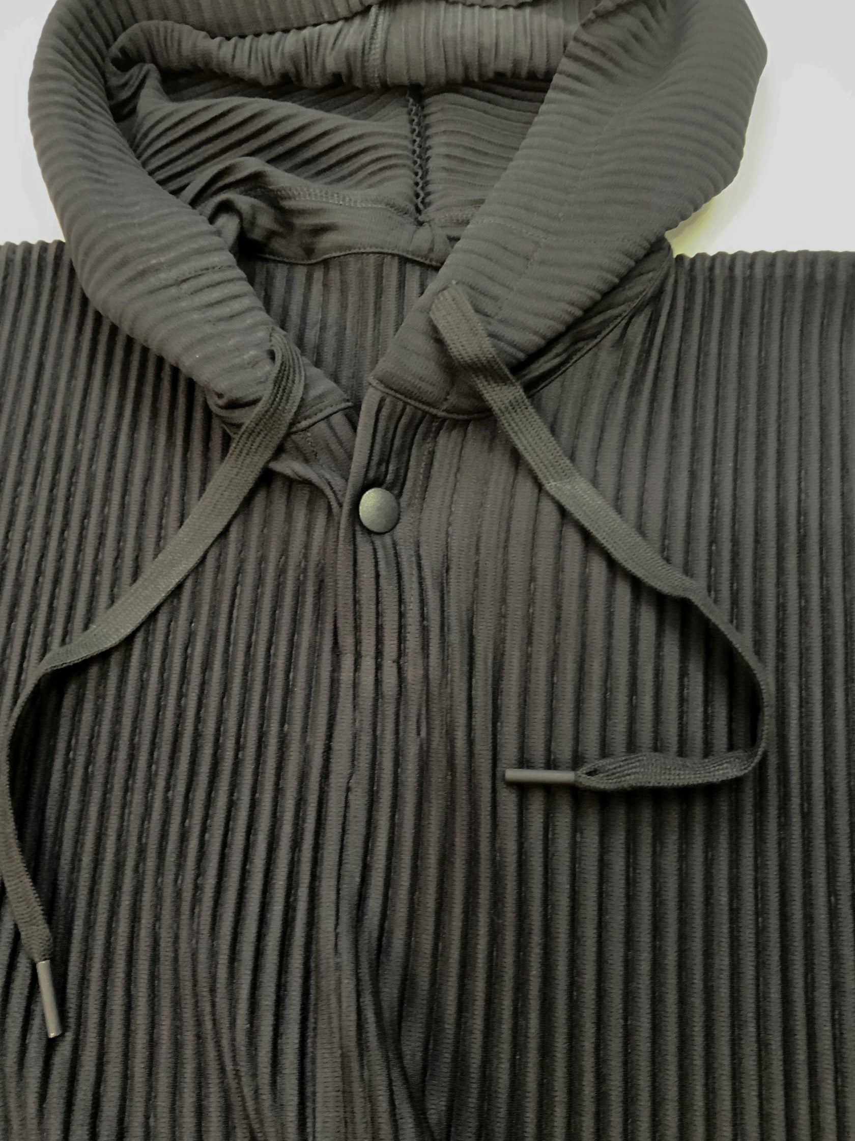 Crafted in the brand’s iconic pleated technical fabric, the hoodie is lightweight, wrinkle resistant, and easy to care for, embodying Miyake’s philosophy of combining avant-garde aesthetics with everyday utility. Cut in a relaxed silhouette, it features a drawstring hood, snap-button neckline, and kangaroo pocket for function and comfort.