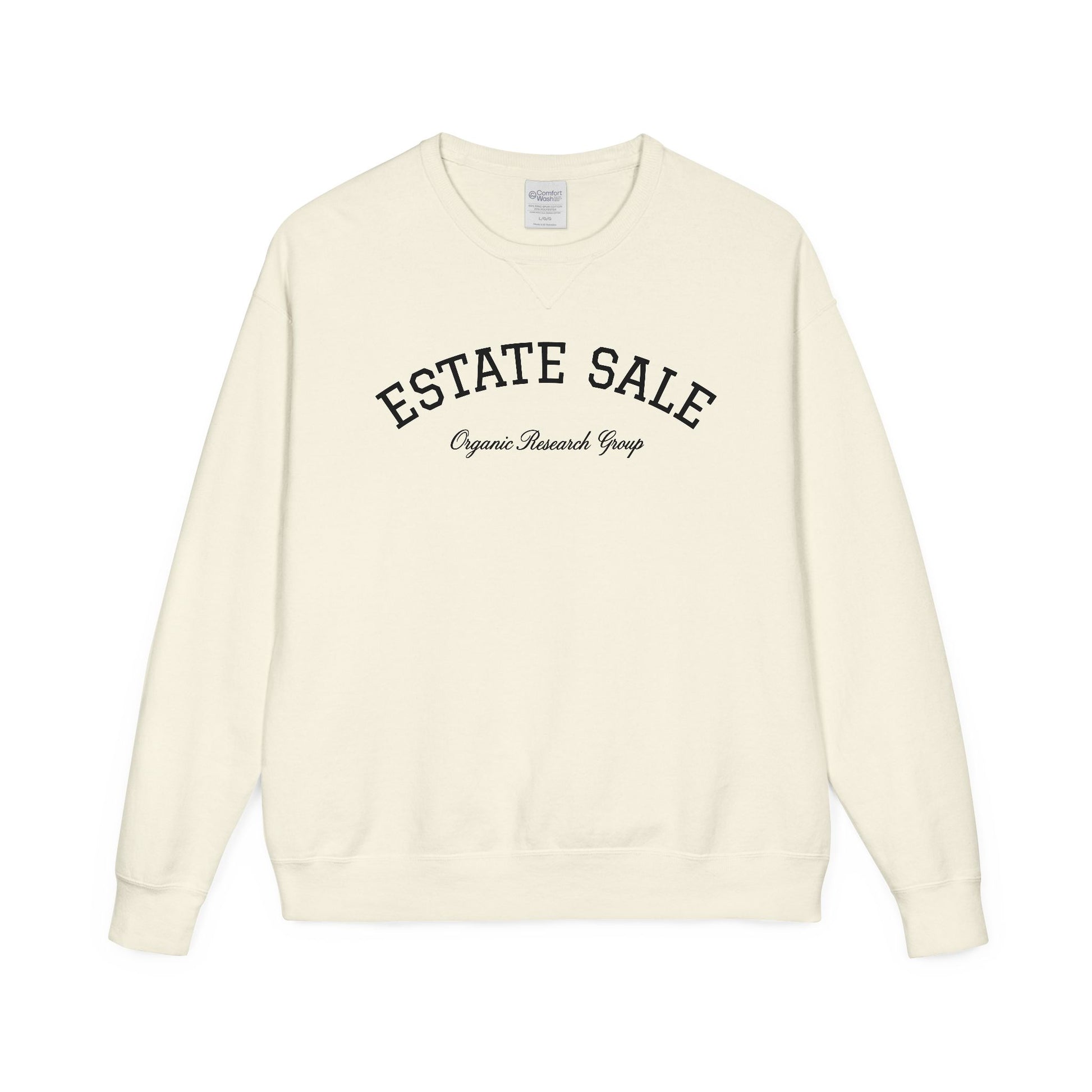 Cotton-rich fleece sweatshirt finished in parchment with ESTATE SALE insignia and Organic Research Group script signature. Wearing it signals you know exactly where to look. And when to keep quiet.