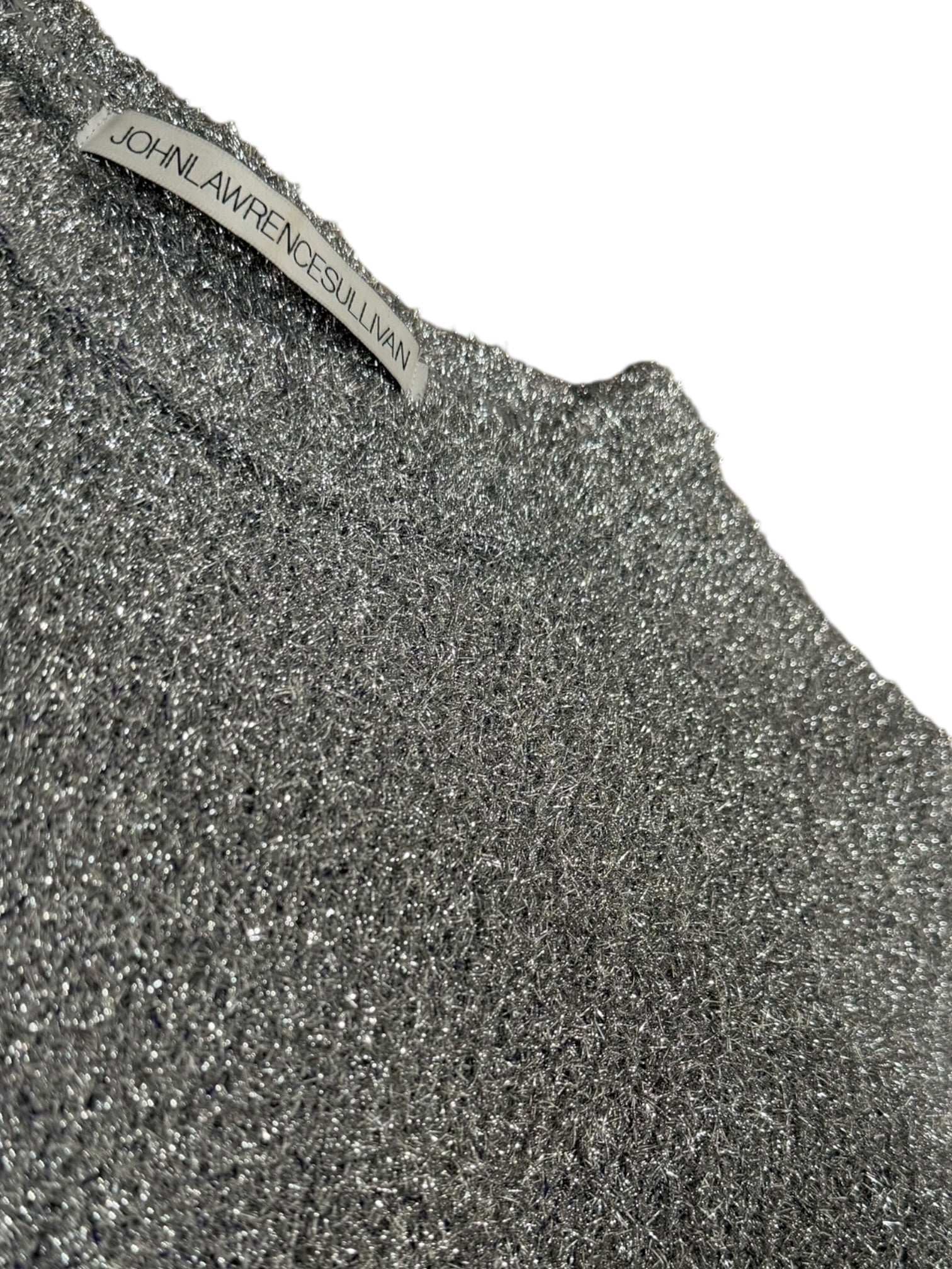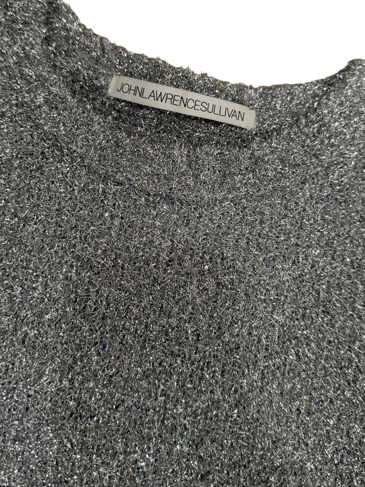 A cropped silver glitter knit from John Lawrence Sullivan, the influential Japanese label known for sharp tailoring and experimental fabrics. This piece features a subtle metallic yarn throughout, giving it a refined shimmer rather than full sparkle. Clean crew neckline with ribbed cuffs and hem, finished in a slightly boxy cropped silhouette.