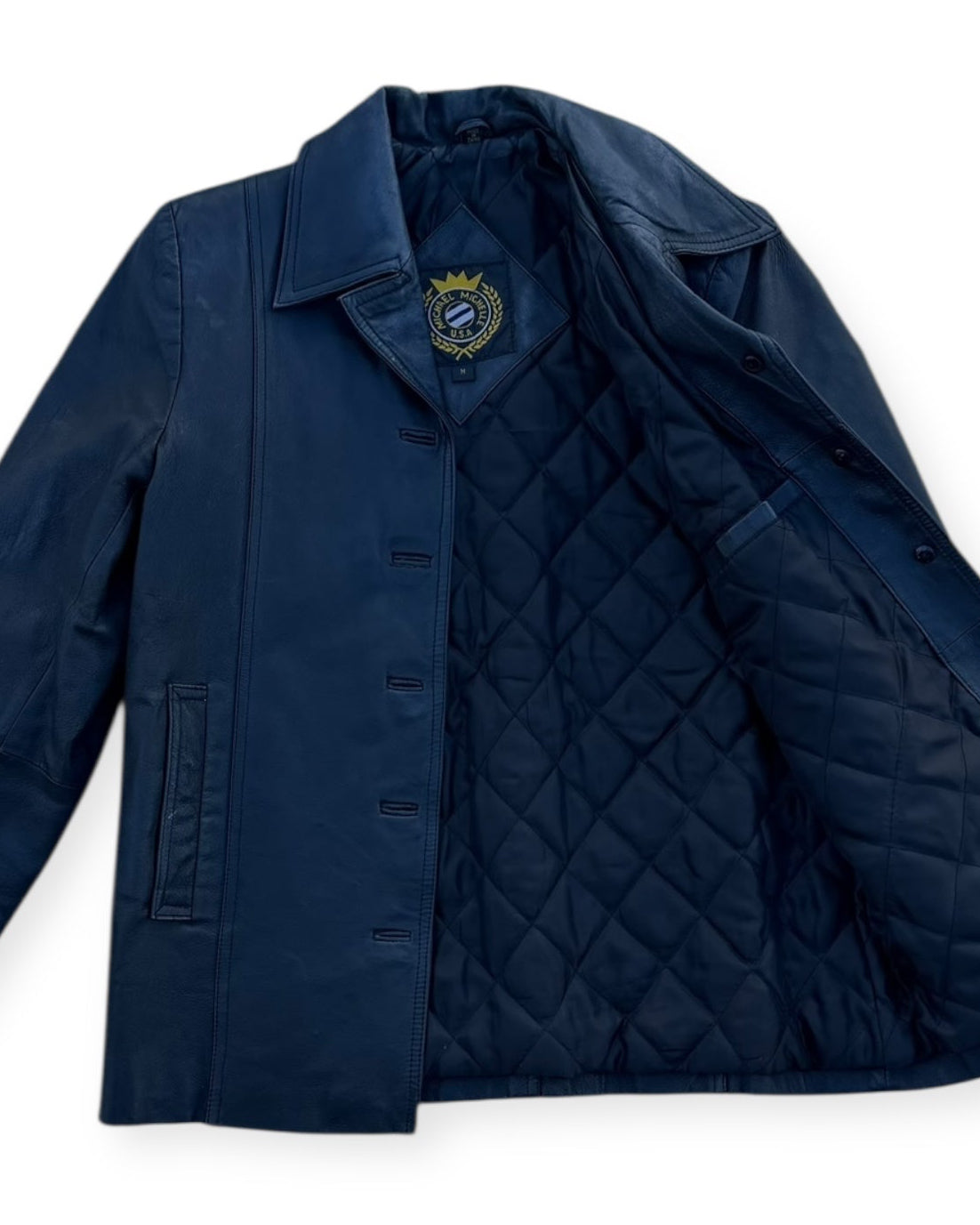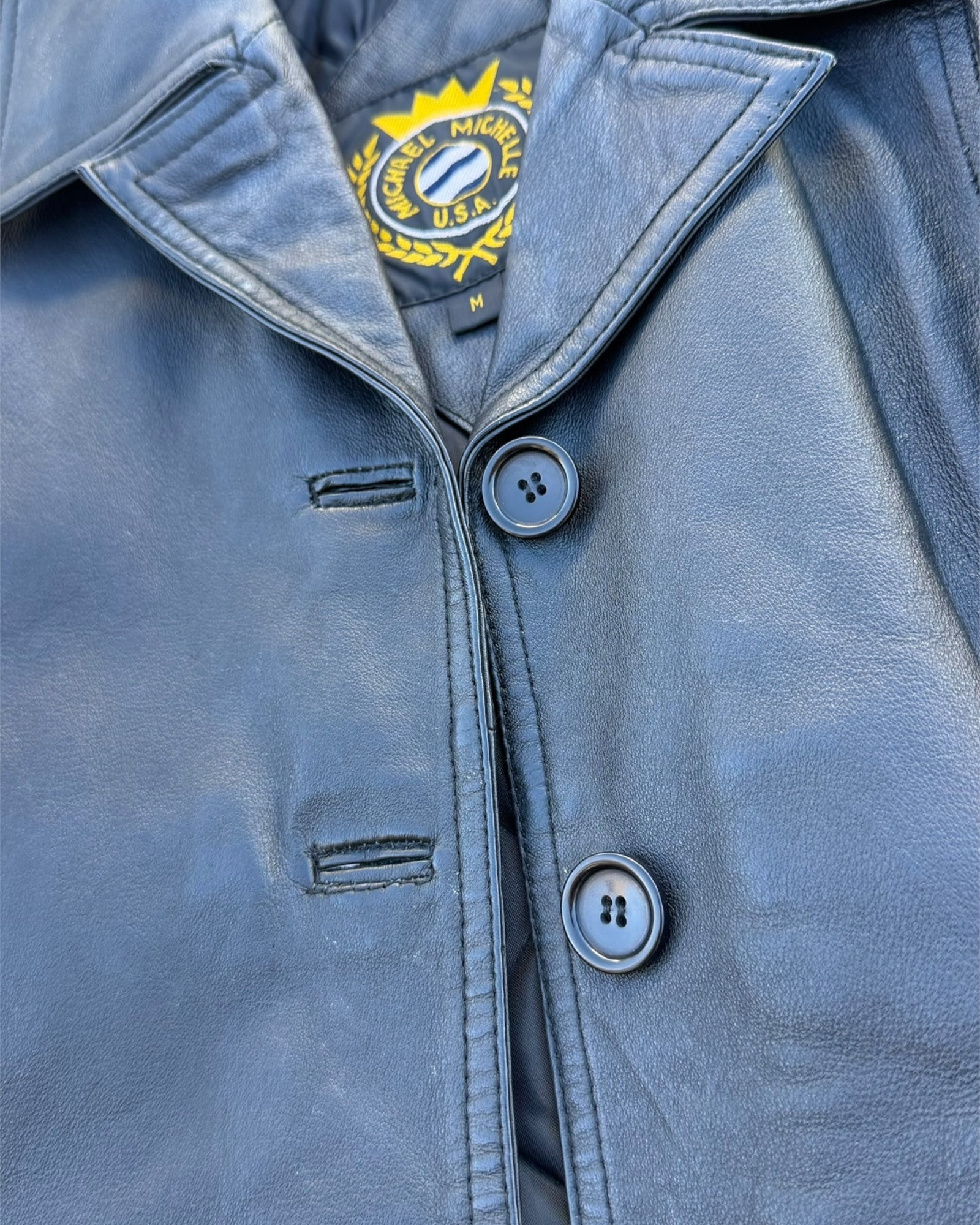 A beautifully worn leather jacket from Michael Michele U.S.A., a brand known for solid American-made outerwear with a classic, no-nonsense approach. This piece sits somewhere between a chore jacket and a tailored leather coat, finished with a sharp collar, clean button front, and subtle paneling that gives it structure without feeling stiff.