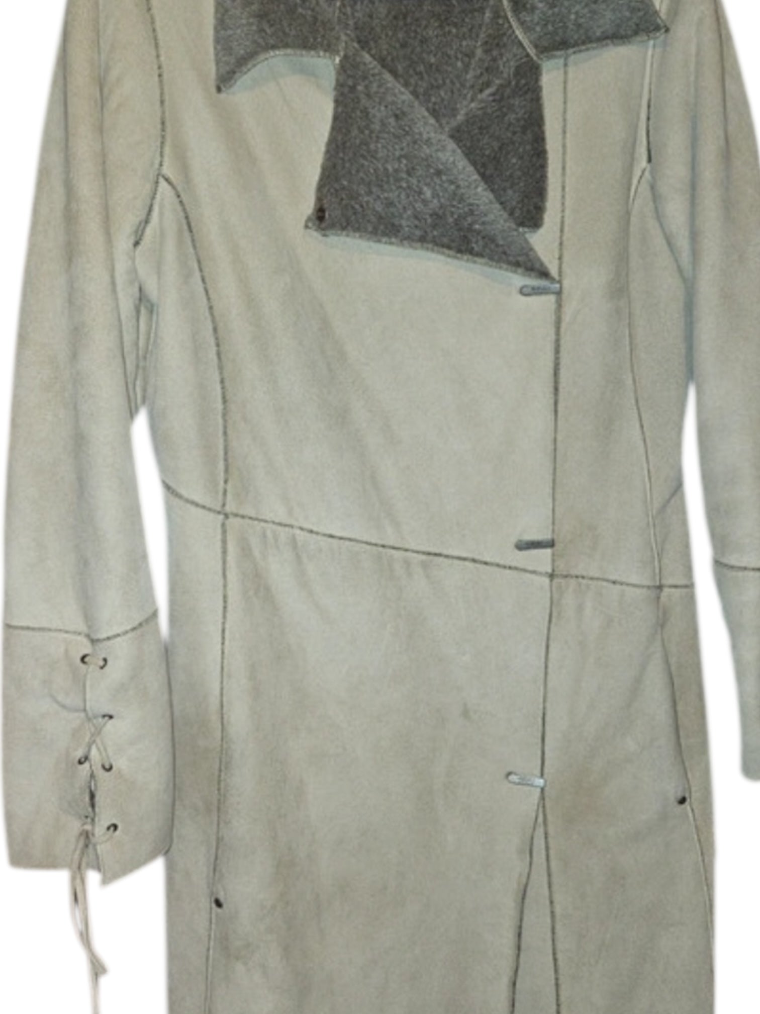 Versace Sport longline coat from the 90s. A rare piece from the era when Versace Sport leaned into sculptural outerwear and unexpected detailing. The exterior is a soft sand-tone faux suede with a heather grey felt interior that gives the whole coat a deconstructed, layered look. The oversized draped lapels fall naturally and the curved seams shape the coat without feeling rigid.